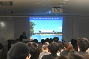 「みんなの家」では川田祥子さんから「みんなの家」とワイン販売についてのお話をお聞きしました。また「みんなの家」の老朽化などによりリニューアルを考えられているそうで、今年度はまちづくり演習の一環で「みんなの家」の改修案について中間発表をさせていただきました。参道から中庭に視線を貫かせる案や、吹き抜けを用いて1階から2階の販売スペースを見せる案、廃材やワイングラスを用いたインテリアなど好評を頂きました!